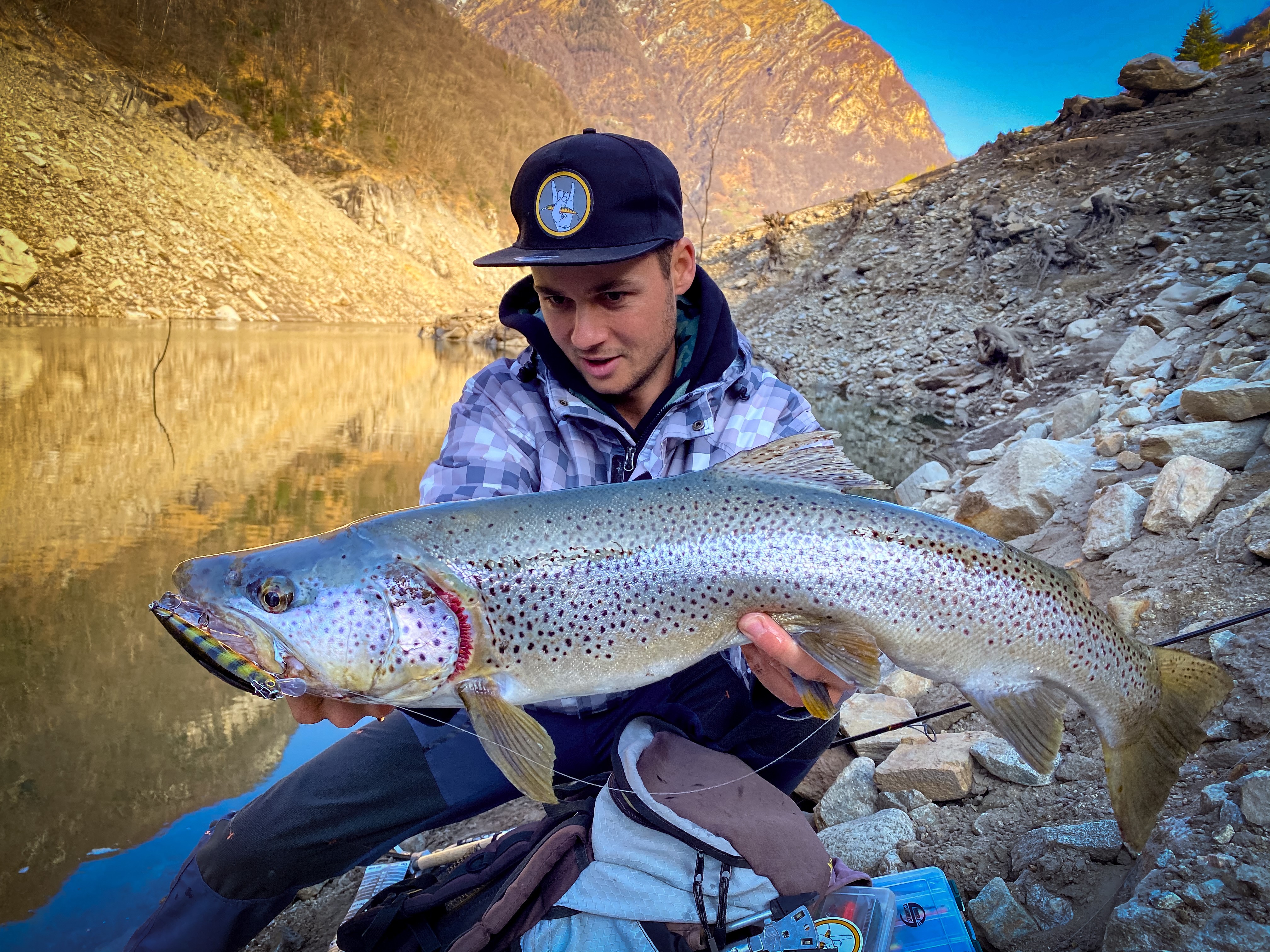 Primo tentativo dalla coda, appena entrano i primi centimetri il pesce scoda via. Secondo tentativo dalla testa, rischiamo parecchio ma oggi è la mia giornata e il pesce esce dal guadino con ancora l’esca ben piantata sulla sinistra del muso. Terzo tentativo, si arrende e in qualche modo entra nel guadino. È un pesce lunghissimo, piuttosto magro, forse per la vecchiaia o forse per chissà quale altro motivo, ma è impressionante! La coda sembra un pinna da sub, la testa è mostruosa, con quel becco ricurvo nella parte inferiore. Sono incredulo, scioccato, ma così soddisfatto! È la trota della vita, presa così, da riva, con un’esca artificiale. È tutto perfetto.